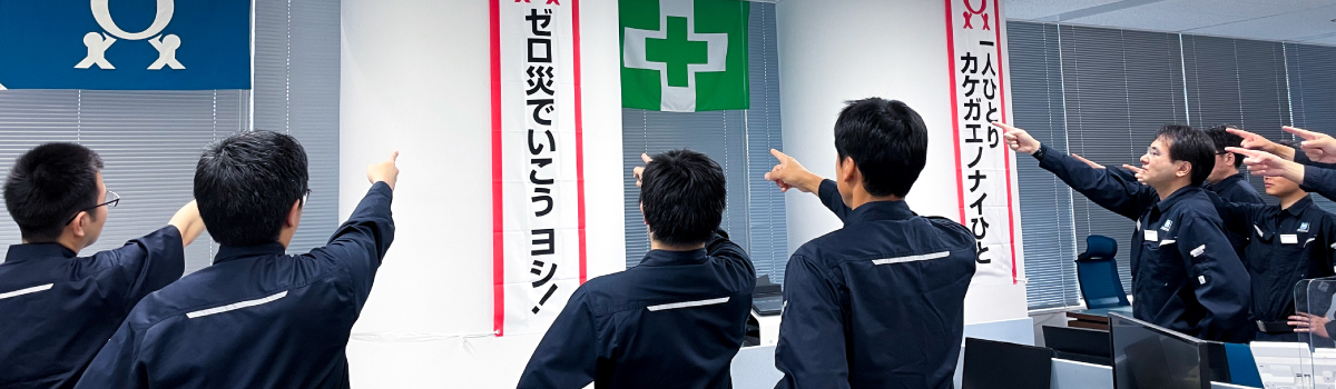 作業に従事する者が、事故や災害を未然に防ぐことを目的に、作業に潜む危険を予知し、安全作業を行う訓練です。ミーティング等を通じ、危険性の情報を共有することで、会社全体として予知できる事故や災害の未然防止を徹底しています。また、毎日の始業時・作業開始時に全員による安全唱和「ゼロ災でいこうヨシ!」と、指差し呼称を行うことにより、安全に対する意識をさらに高めています。