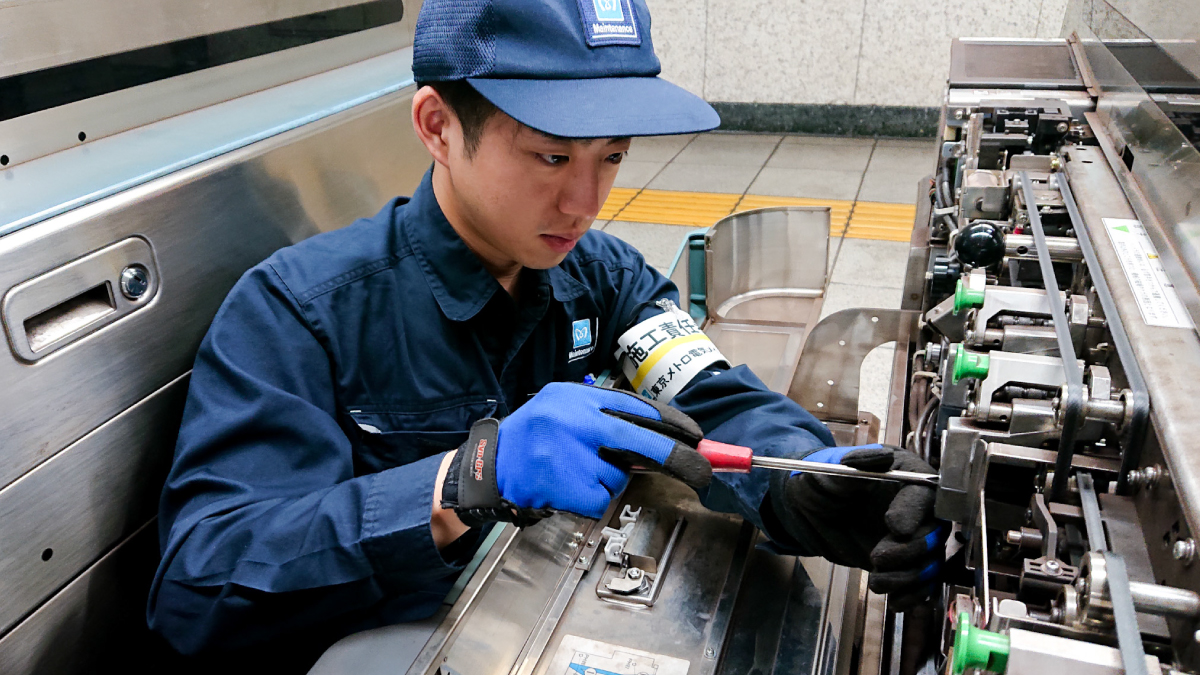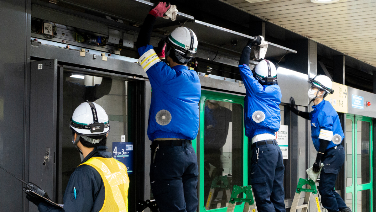 ホームからの転落や列車との接触を防ぐため、東京メトロではホームドアや可動ステップの設置が急速に進められています。ホームドアは列車の扉と連動して開閉し、お客様の安全と列車の定時運行を担う高度なシステムで稼働しているため定期的な点検が欠かせません。ホームドアにはさまざまなタイプがあり設置数も多いため、協力会社と共に夜間を中心に点検作業を実施。一部では営業時間中に当社社員による点検作業も実施していますが、監督業務を主として、作業全体の安全管理や点検後の最終動作試験などを行っています。