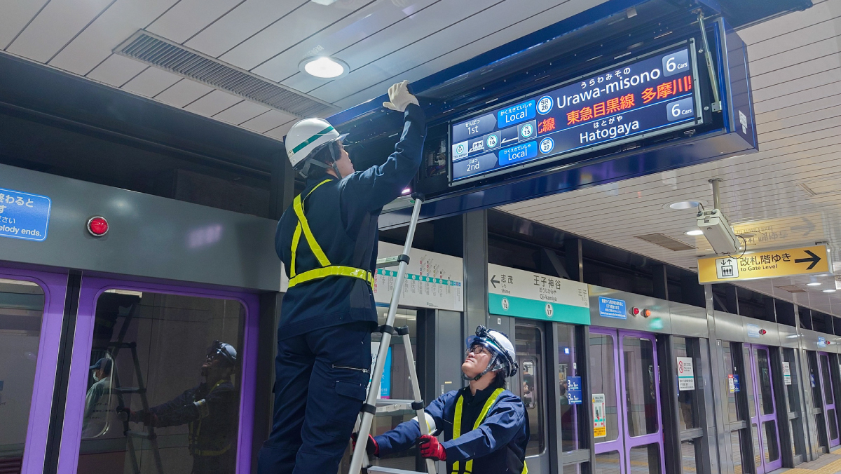 駅構内には、安全確認やお客様への情報発信を担う多様な設備が設置されています。当社では、セキュリティ監視カメラ、列車監視カメラ、放送装置、トイレ合図器、ホームの自動旅客案内装置および車両情報管理装置のほか、携帯電話の基地局およびWiMAX設備などの保守管理を担っています。各設備は、駅構内やトンネル内などさまざまな場所に設置されているため、地下鉄の隅から隅までを知り尽くし、お客様の安全と利便性向上に貢献しています。